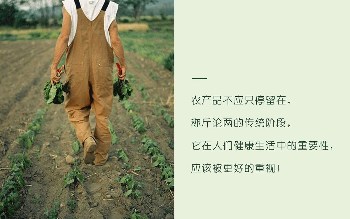 幫助良心企業塑造誠實品牌 農產品不應只停留在,稱斤論兩的傳統階段, 它在人們健康生活中的重要性, ?應該被更好的重視。 這一次我們接受委托的項目,是關乎大眾身體健康和對健康食品認知有盲區的品類:有機食品,這讓設計團隊深感責任在身,如何誠實、客觀的塑造品牌形象,是這一次設計項目需要解決的根本問題。